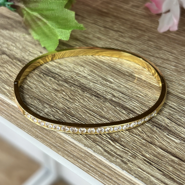 Bracelet jonc en acier inoxydable orné de strass scintillants. Élégant et résistant à l’eau, il apporte une touche de lumière à votre poignet tout en restant sobre et raffiné.